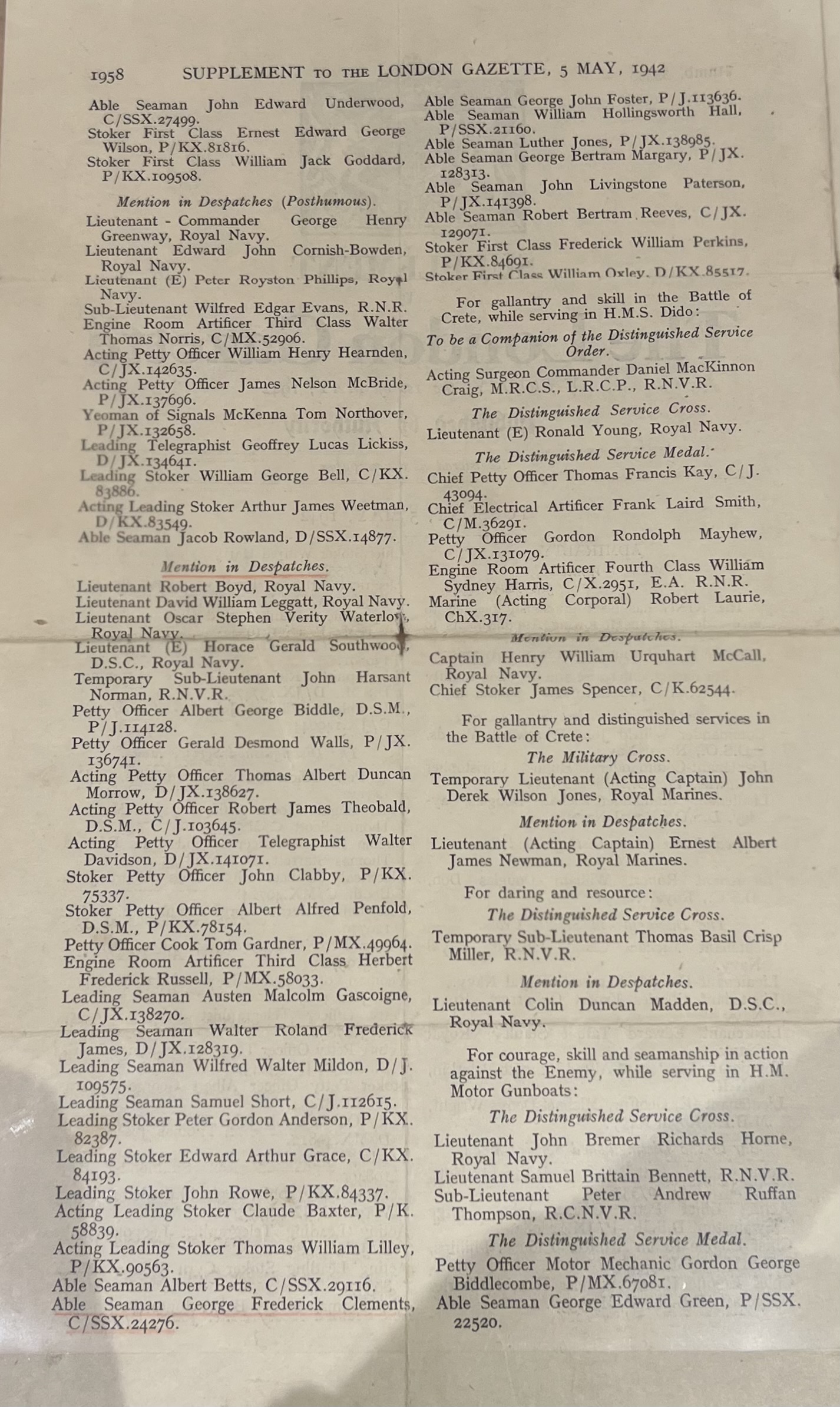 Billy was mentioned in Dispatches for bravery shown in HMS Dido in the evacuation of Crete in May 1941. He was writing home in April 1941 from HMS Triumph, so it seems likely that he was loaned to Dido for some reason. His service record card at Kew should give an answer wnen we get the chance to look at it.