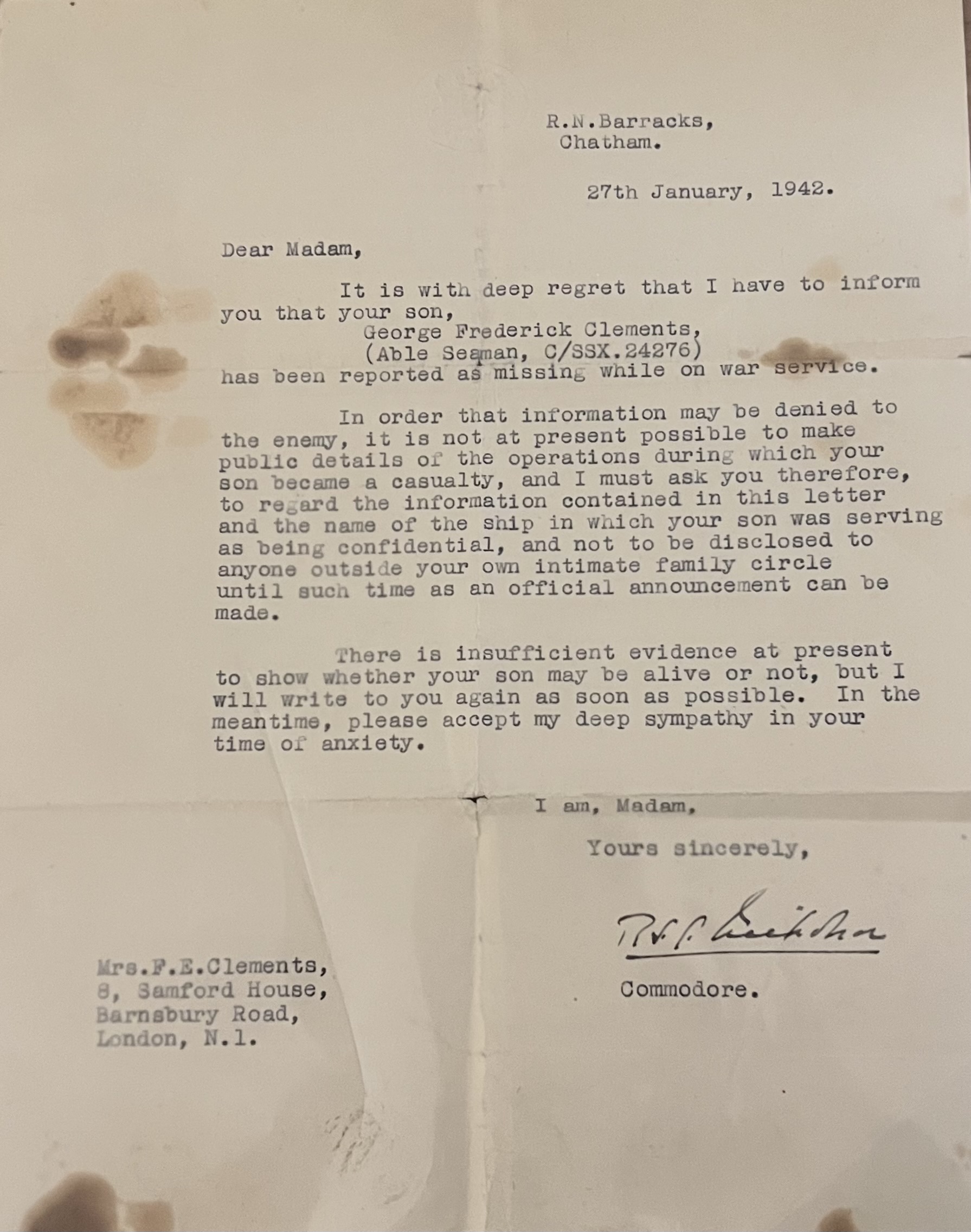 | Able Seaman George Clements SSX 24276 | Mother, Florence Clements, 8 Samford House, Barnsbury Road, London | Carla Peagram, great niece, Colin Clements, nephew | George was born 15 Oct 1918. He joined the RN in January 1938, and served first in destroyers. He fought at Narvik in HMS Bedouin in April 1940.