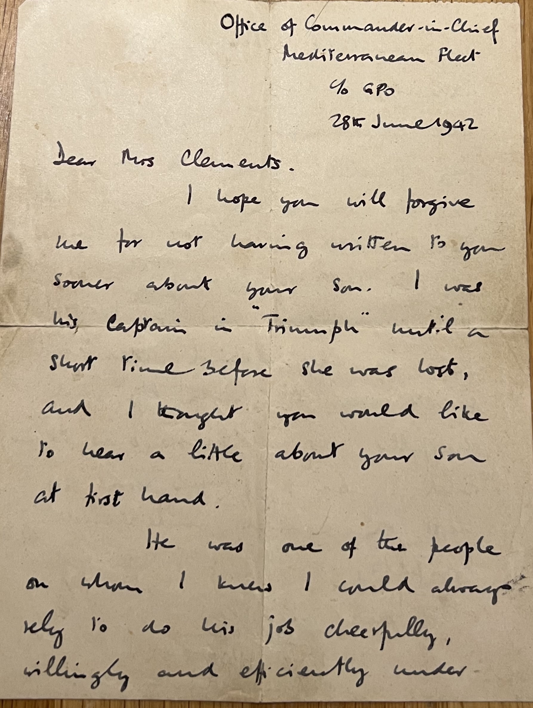 After George was lost his CO in HMS Valiant, Captain C E Morgan, wrote a three page letter to his parents...