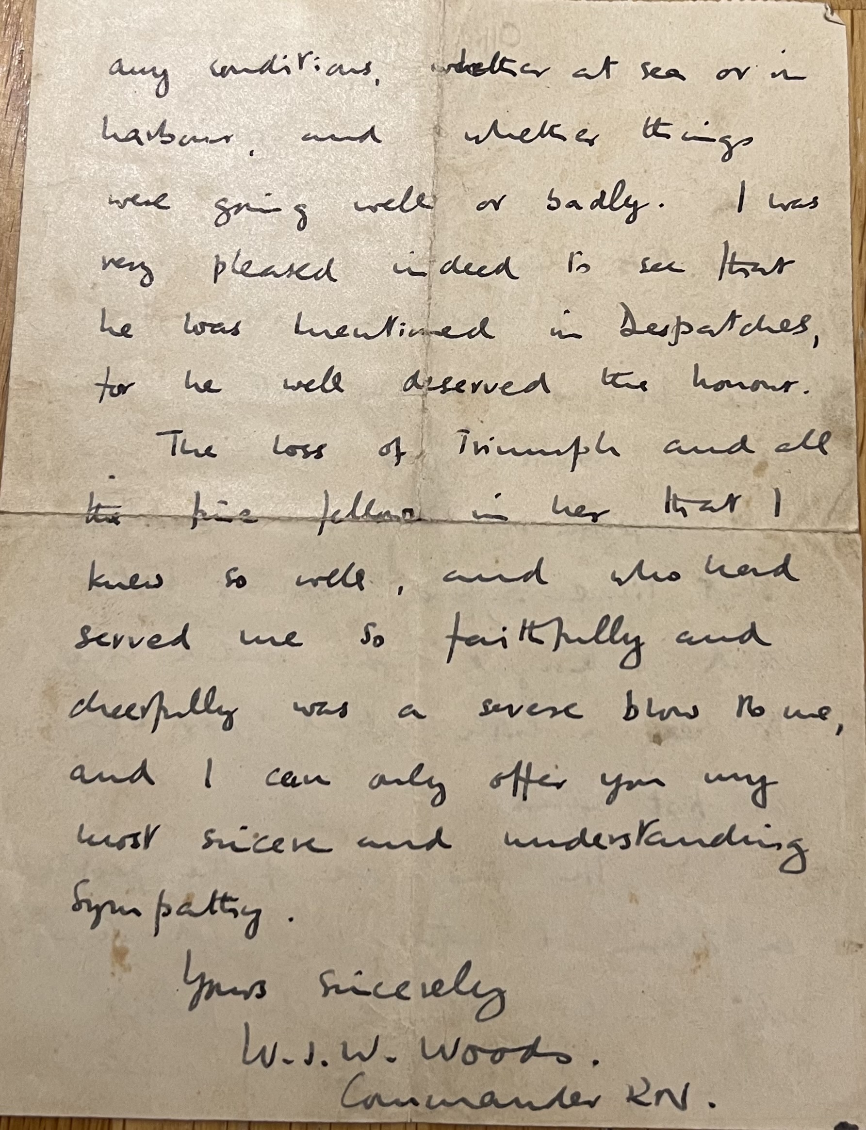 This is Sammy Woods' letter to Reg's family. Though he had left the boat, Sammy wrote to all of the families of those lost.